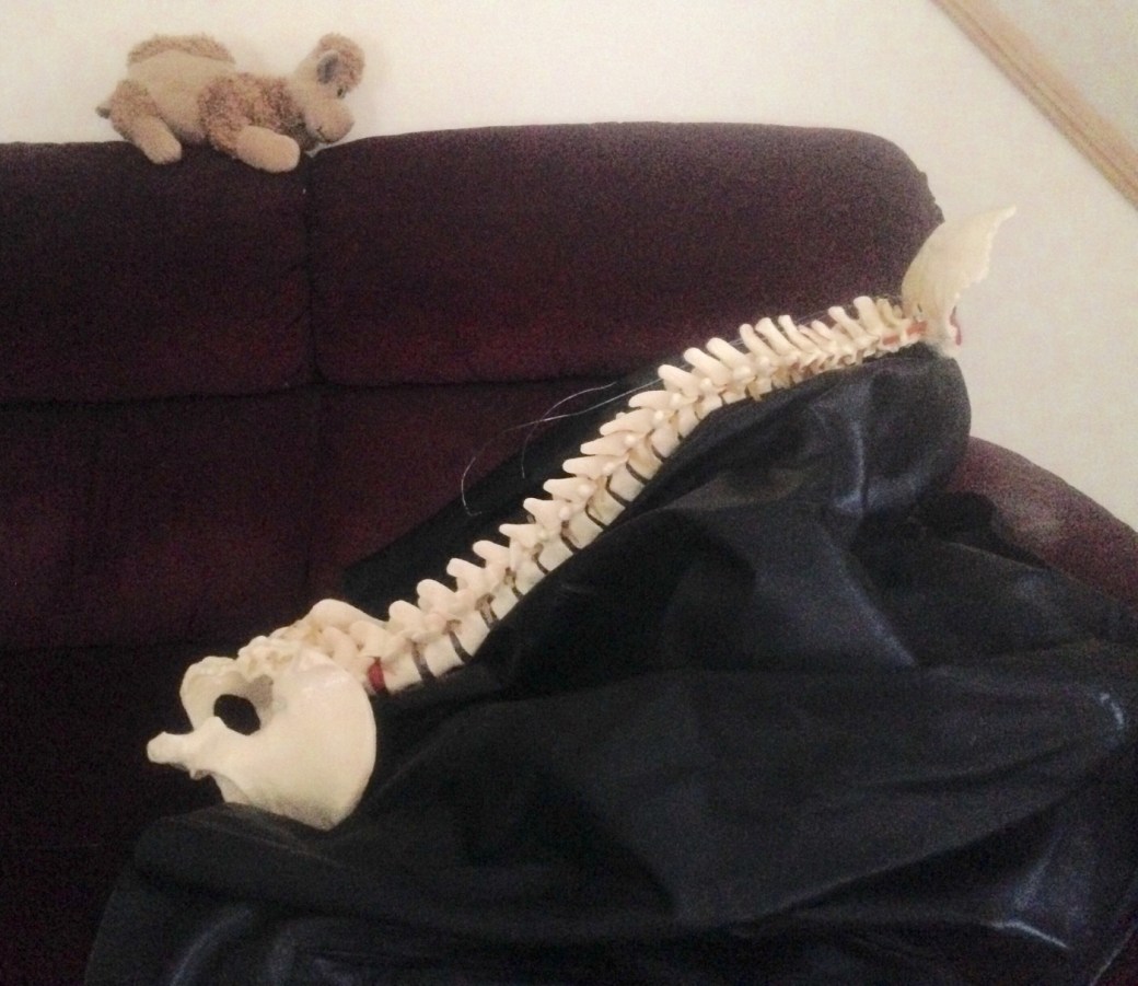 This is a borrowed spine draped over an old leather jacket. I am drawing and photographing it for a logo. I wanted to see him/her lying facedown. Dromedary is the supervisor.