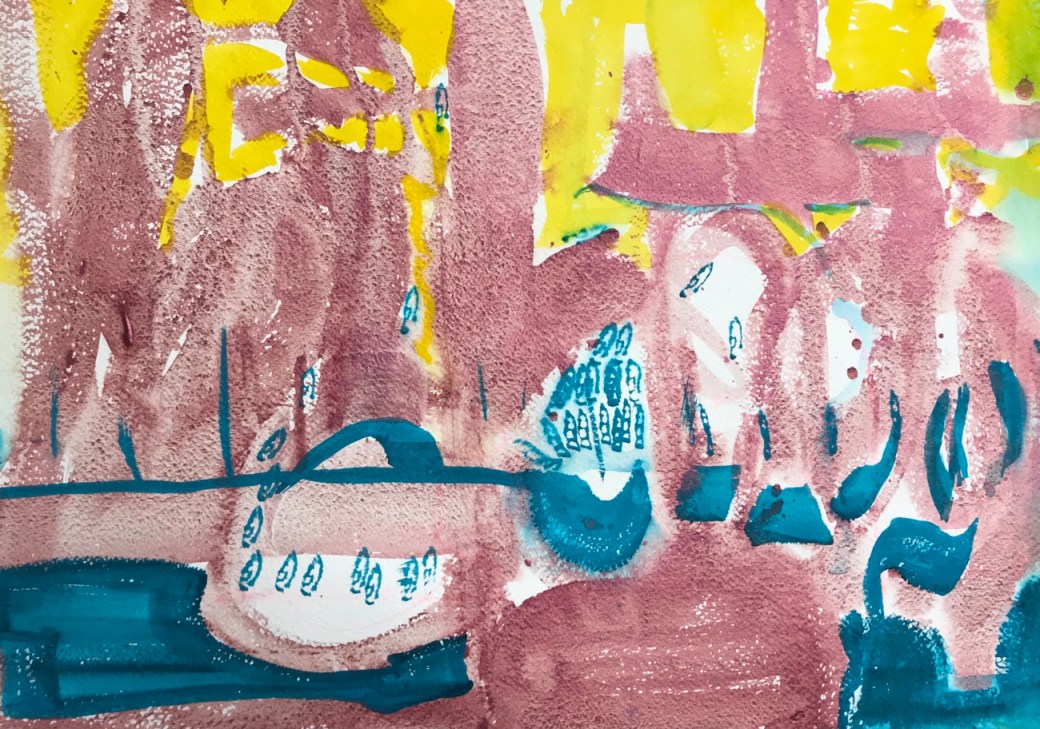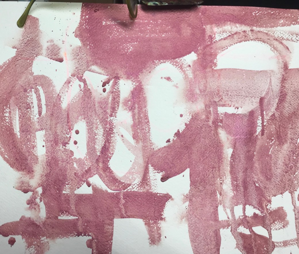 First schmear with Daniel Smith iridescent ruby watercolor, 20 by 14. Fabriano artistico cold press block.