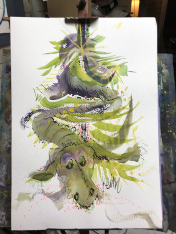 And here’s my Christmas offering. I started out to paint a colorful Christmas tree, but my brush got away from me and the tree turned into a gator. So, here is my third Florida Christmas Day painting. Watercolor and inktense pencils on Fabriano cold press.