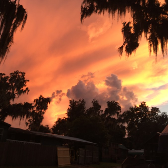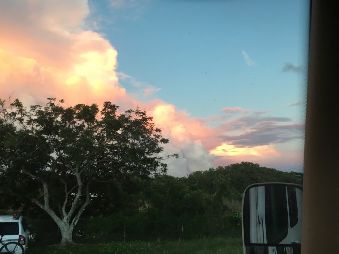 One from my bucket list. We are in a park here in the titillating swamp with our little house on wheels. Today I will try to ride an airboat. May chicken out. Stay tuned. Meanwhile here’s last night’s sunset looking east toward Miami. There was a big storm which caught the sun’s last rays.