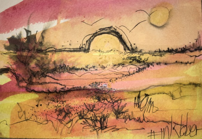 This is a quartersheet watercolor, taken into Paper53 to add the orange. I can’t decide if I want to add the orange in real paint. Any observations are welcome. I think this painting has something to do with the heat and humidity here in Florida where I live. The colors here and the stretching blue skies are whelming, maybe overwhelming at first. It rains every afternoon lately so we get all kinds of sky shows.